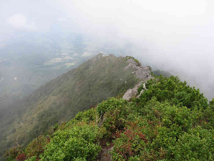 突然、目の前にはコンクリートブロックが積まれたような岩尾根が現れた。写真でしか見たことがなかった「ゴジラの背中」に到着したのだ。正面に向く前に周囲の展望を確認する。この場所に着くまで、周囲は霧に包まれていたのだが、岩尾根に着くと同時に周囲の展望が開けてきた。