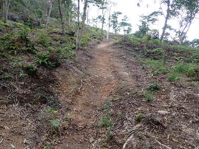 後ほど登る予定の藤尾山を北に眺めて兜山を出発、坂を下り交差点から臼美歩道の案内に従い坂を登る。当日は右側に個人の家が建築中だった。進路は一旦左に変わり、すぐに右へ戻る。