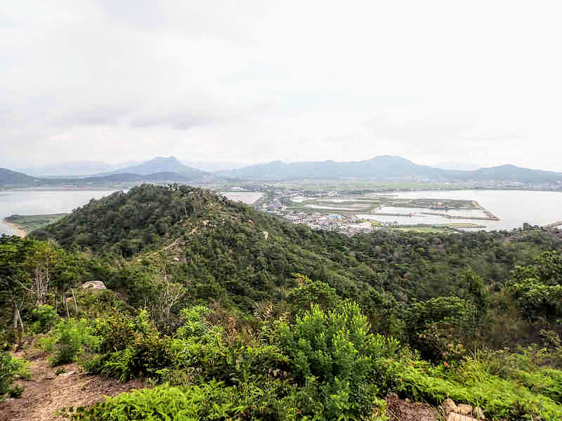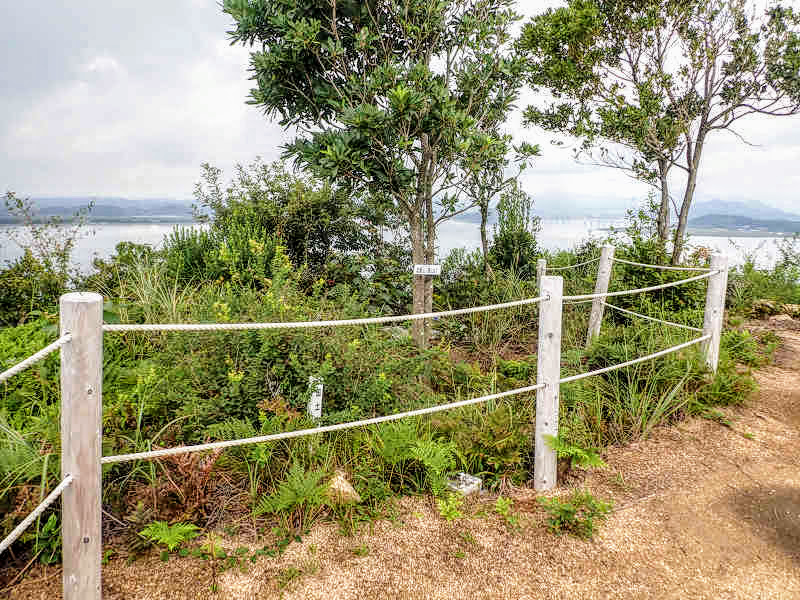 岩屋山を出発し次のピークへ向かう。一旦高度を下げて登り返す。岩屋山を振り返ると山頂に立つ木が印象的だった。間もなく80mのピークへ着き、火の山や亀尾山等の展望を眺める。やはり展望が素晴らしい。