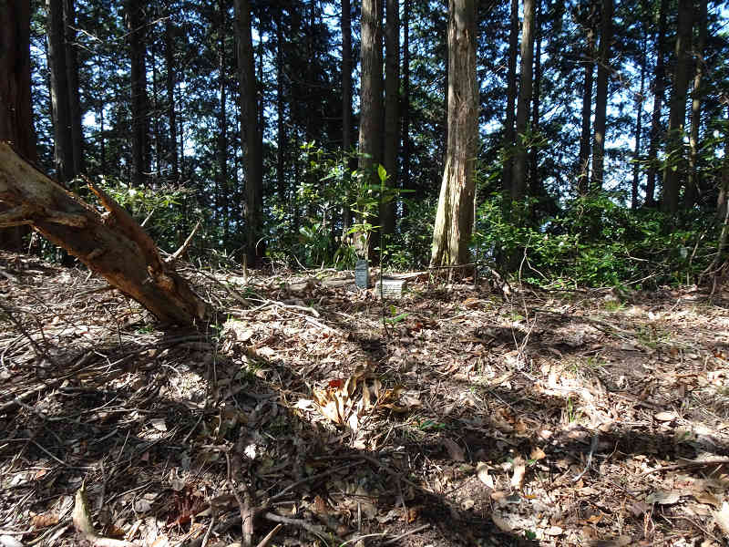 鎌ヶ山を出発し、西峰へ向かってみる。山頂からわずかに下れば平坦で快適な尾根道歩きが続く。すっきりした展望は望めないものの、南の樹間越しに現れる山脈は見つけることができた。やがてわずかな坂を登り返せば鎌ヶ山の西峰へ着いた。