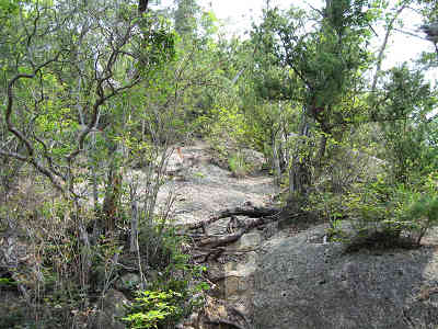登山路には目印のテープが張られており、岩を迂回する方向には矢印も書いてあるので迷うことはない。登山開始から30分で標高370m、岩場コースと普通コースの分岐に到着、標識には「ムリしないでネ」と書いてある。一気にここまで登ってきたので絶壁の岩にて小休止を取り、岩場コースに向かう。