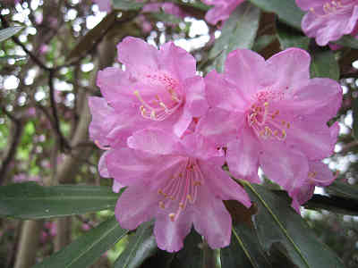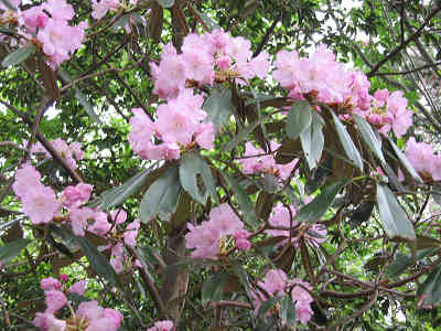 鎌倉寺山のシャクナゲを観賞する 昼食後は山頂周辺のシャクナゲをしっかりと観賞し、沢山の写真を撮る。山頂での展望は望めないがこれだけの花が咲いていれば充分にすばらしい。しっかりとシャクナゲを鑑賞したので下山を開始することにした。 三人の方に下山道について聞くと、今回駐車した場所に向かって下りるには、先ほどの分岐を牛若地区に向かって下りると牛若地区の車道に降り立ち、安全に元の駐車地まで降りることが出来る。キャンプ場の方に下りた場合、駐車地までの県道は狭く、車の往来が激しいので危険だと注意を受けた。お礼を述べてこの方達と別れる。三人はもう少し先の方を散策すると言うことだった。 鎌倉寺山山頂を出発して下山の分岐に向かい、牛若地区に足を踏み入れて一思案、このまま牛若地区に向かって下りる方が時間も早く楽々ではあるが、こんなに楽しい岩尾根にはそうそうお目のかかることは無いだろうし、この先鎌倉寺山に来るとしても当分先になりそうだ。 みすみすこんな楽しい場所を迂回して帰るなんて勿体ない。岩尾根を引き返すことにした。 分岐を出発、岩尾根に立ち向かってゆく。岩場をよじ登っている自分の姿を想像して楽しくなる。今日は綺麗なシャクナゲを観賞、大好きな岩場三昧の登山に感激、休むことなく岩尾根のアップダウンを続ける。時計を見ると午後1時半、もうすぐ槍ヶ峰に向かう場所にて10名程度の登山者とすれ違う。この後も更に10名程度の登山者と出会い、この山が本当に人気のある山であることを実感した。