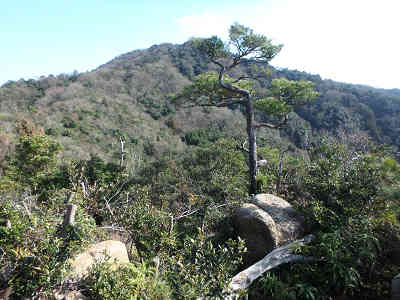 壁岩、饅頭岩、炙り岩が見えてくれば東峰の手前ピーク、大岩上からは亀尾山がよく見える。更に進むと右に福西山への分岐(約1時間)を通過、すぐに東峰(230m)へ到着、最終目的地の西峰は目の前だ。