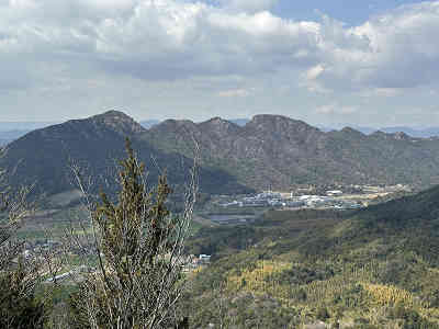 枝振りの良い松の先には亀尾山がそびえ、美しい山容を見せており、亀尾山へ続く尾根上には午前中にお花見をした山桜が咲き誇り、いずれも素晴らしい展望です。展望所で大休止の後、坂を下ります。