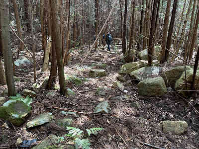 下山は北へ下る道をとり、急な坂を下って沢沿いに出ました。この道は以前通った道であり、鞍部から登り返すと北の夫婦岩があり、見覚えのある大岩に懐かしさがこみ上げました。この北の夫婦岩の前で小休止の後、南へ進むと勘十郎岳への縦走路に合流しました。