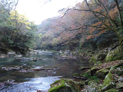 前回より新調されたロープを補助に快調に飛ばす。江毛九郎堰が近くなると、左側に岩海のような状態の苔むす岩を沢山眺める。更に進み五右衛門風呂の風呂釜を過ごせば蔵目喜川へ向かう分岐があり、進んでみると対岸に紅葉を眺めることができた。