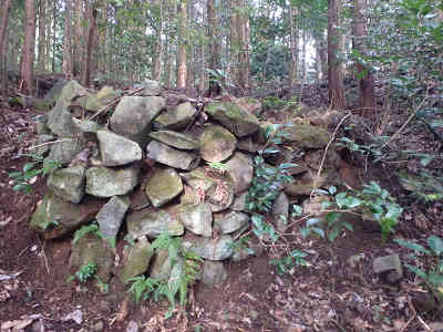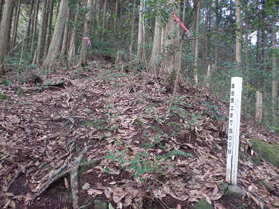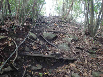 登山道沿いにピンクのテープが続いているので、この案内に従い進めば迷うことはない。自然林の下を慎重に登る作業が続く。やがて周囲は植林帯に変わり、少し進むと二つ目の炭焼窯跡を過ごす。足下に岩が増えてくると、周囲に岩海状の場所を見ることができる。