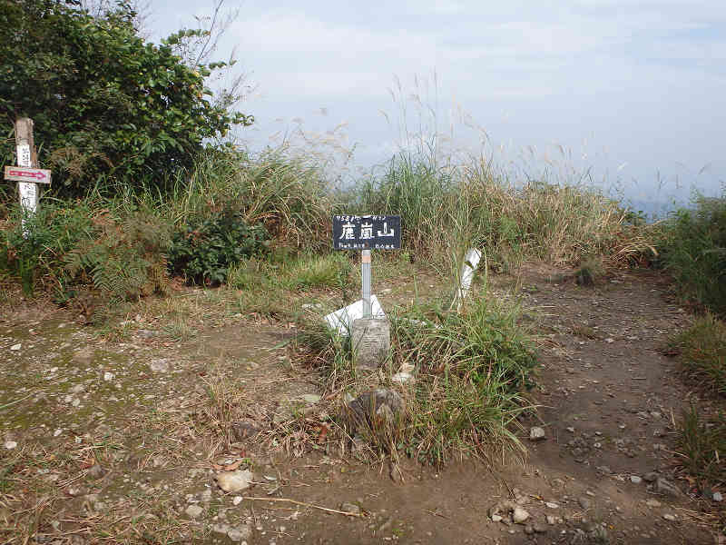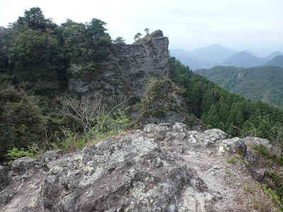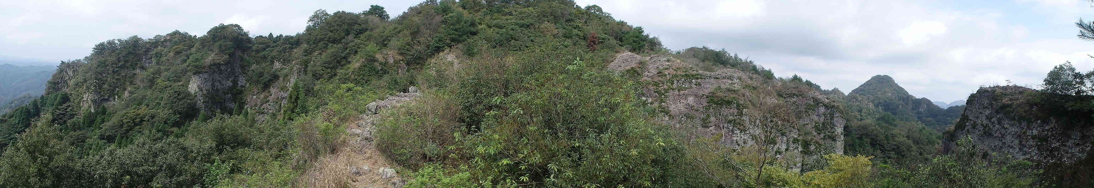 もう山頂までは200M、すぐに坂の傾斜が緩み、平坦な尾根へ出た。なお、この尾根へ出る手前で、石垣を見つけた。この山は山城だったのだろうか。さて、平坦な尾根をわずかに進めば、苔むす祠の置かれた雌岳山頂へ着いた。雌岳からの展望は樹間越しなので、大展望というわけには行かない。 北に霞気味の周防灘を眺めて山頂を出発。山頂からは一旦坂を下るが、足下は滑り易いので慎重に鞍部まで下る。鞍部へ着けば、右に中央登山口へ続く道が分岐している。鞍部を出発して雄岳へ向かうと、すぐに頂上まで200M標柱を過ごす。 雄岳へは真っ直ぐな登りがつづき、特に残り100Mを過ごせば、更に坂の傾斜がきつくなる。これを乗り切れば、平坦な雄岳山頂へ到着。一等三角点の置かれた山頂からは北に周防灘が一望だが、本日は少し霞んでいる。 眼下には露岩の目立つ風景が広がり、紅葉の時期には堪えられない美しさだろう。左側には本で眺めた「地蔵峠の景」と同じ風景が広がり、ようやくこの地に立ったということを実感した。しばらく感動的な風景を眺めた後、下山を開始する。