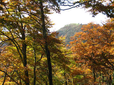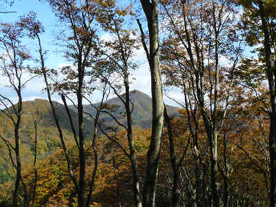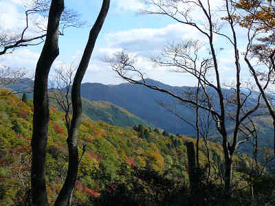 少し北に下りた場所からは大山と烏ヶ山が美しい。小休止の後白馬山を出発、紅葉の樹林の下を進めば正面には木の間越しに金ヶ谷山の特徴ある山容が覗いている。右下には笹原が美しく、笹原の上には紅葉が広がる。右手には土用ダム湖が木の間越しに広がり、遊歩道に立つ「毛無山・朝鍋鷲ヶ山」の標識・「中国電力」の標識を過ごすとここは俣野越、カタクリ山と金ヶ谷山の丁度中間点となる場所である。