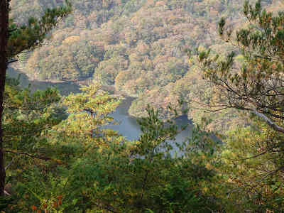 前方には大岩が垣間見え、もう岩場が近いことがわかる。すぐに大岩が右に現れその大きさに感激、これから先が冠岳のハイライト。まず右に岩を見ながら折り返すように南へ進路をとれば、最初の展望岩の上に立つ。紅葉の先に小瀬川ダム湖、左に宝田山、南にそびえる大師山・白滝山・黒滝山は霞みながらも存在感を示している。