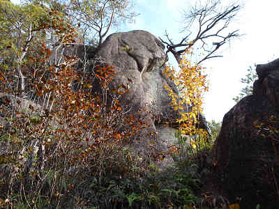 東には三倉岳がそびえているが少々逆光気味である。展望岩を出発し岩の間を縫って高度を上げる。これから先は奇岩大岩鑑賞が続く。三角の岩の左から下に続く分岐を見つけたが、これは国道に下る道かも知れない。足下に背の低いシダを見ながら高度を上げる。