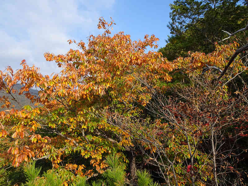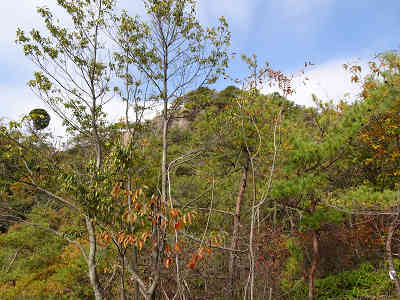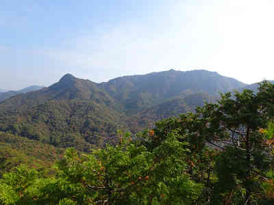 美しい紅葉を眺めながら一旦坂を下りすぐに登り返す。樹間越しに南を眺めれば尖峰の大師山、山頂部が平坦な白滝山が顔を出していた。当日は霞み気味の天候なので鮮明な展望を得られないのが唯一残念なところである。