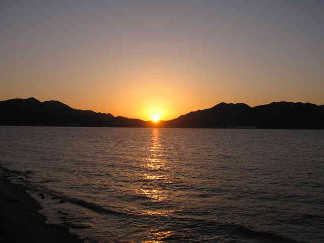 登山終了は午後5時前、次は夕陽を追って海岸線に向かう。サンセットビーチを過ぎて多々羅大橋の見える場所が夕陽スポット、つかの間のサンセットタイムを楽しんでいると、夕陽は伯方島に向かってゆっくりと沈んでいった。