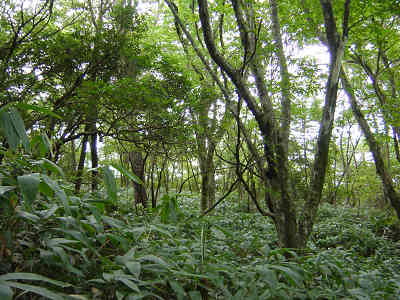 また、長野山には車で上がることができるらしく、皇座山で見たような無線機を持って通信をしている人がいた。展望を満喫したので下山を開始した。本日は天気が良く緑が鮮やかである。再び笹の道を抜け、ブナと笹の緑に感激し、馬糞ヶ岳との分岐点で馬糞ヶ岳に向かってみようかとも思ったが、道がよく分からないのでそのまま降りることにした。