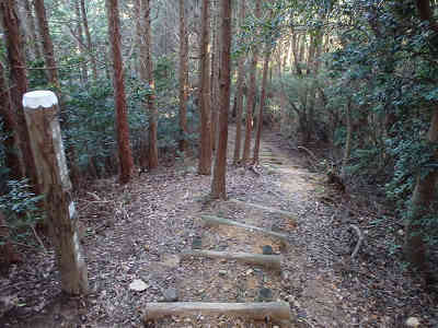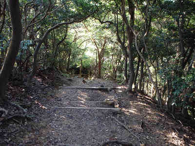 間もなく叶岳から1.6km、下ノ城址へ2.6km地点を通過、更に200m進むと、頭上を樹林帯に覆われ、しばらく木漏れ日を浴びながら進む。九州電力西福岡今宿線49号鉄塔への案内を過ごせば、叶岳から2.2km、下ノ城址までは2kmで、縦走路の中間点を過ごしている。間もなく右に50号鉄塔を過ごし、少し先では野外活動センターへ1.3kmの案内を過ごす。こうしてみると、野外活動センターからはいろいろな地点へ道がつながっていることがわかる。 もう下ノ城址までは1.7km、山腹につけられた道をジグザグを描きながら高度を上げる。やがて作業道跡のような平坦な場所に着き、進路を左に採る。次に階段状の坂を上り、すぐに進路を右に採る。もう下ノ城址までは1.4kmとなり、木漏れ日を感じながら軽快な登山が続く。