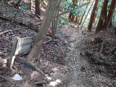 下ノ城址まで1kmを過ごせば、右に志賀見台への分岐を見送り、花崗岩の風化した道を辿って標高385m地点へ着く。ここに置かれた西消防署の標識にはC9と書かれており、右方向には高祖自然観察路の案内が立ち、この道を採れば更に野外活動センターへと続いているようだ。下ノ城址へ0.6kmの案内を過ごすと、ガイドに「第一分岐」と案内されている分岐へ着く。この分岐が本日下山の際に使う道であり、縦走路上には西消防署のC12、右の野外活動センター側にはD13の案内が立っている。従ってこの地点から野外活動センターまでは約1300mと言うことがわかる。 分岐から更に高祖山へ向けて進み、すぐに下ノ城址へ0.4kmの案内を過ごす。西消防署のC14を過ごし左側に注意していると、大きな横穴が二つ残っていた。中に何があるのか気になるが、単独行なので中に立ち入ることは控えた。間もなく下ノ城址まで0.2kmの案内を通過、この先で進路は左方向へ変わり、すぐに現れる左右の分岐は、高祖山へ向かって左を採る。なお、右方向はずっと案内に記載されている下ノ城址である。 さて、高祖山へ向かって少しの傾斜の坂を登る。山頂手前で木の根の張り出す道となり、朽ちた花崗岩質の道を辿ると、上ノ城址の高祖山山頂へ着く。山頂は広く平坦で山頂に置かれた案内には中世山城跡と説明されている。 展望は周囲の木々の背が高く、北方面のみ木の間越しに市街地が覗いている。また、北には遠く背振山、金山などが見えているが、こちらも展望は限られている。山頂の案内によると高祖城は中世糸島地方を治めていた原田氏の居城で、上ノ城と下ノ城を中心に郭群を形成しており、天正15(1587)年、豊臣秀吉軍の攻撃によって落城したそうだ。