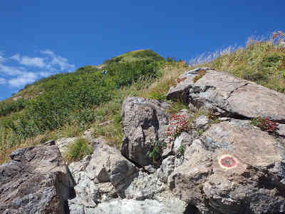 鎖の渡された岩場 鎖場の先にも岩場の難所は続き、慎重に乗り越える。間もなくジグザグを描きながら滑り易い道を進むと、再び岩場に取りかかる。進路は黄ペンキが案内してくれるので○の印を確認しながら鎖を使用して高度を上げる。