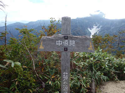 さて、足下には横木の階段が現れ、急な坂を登れば白馬村を見下ろす展望地へ着いた。そのまま奥へ進むと中遠見へ到着、白馬村方面はまだ見えているが、白馬岳や五竜岳山頂部は雲に覆われており、わすかに鹿島槍ヶ岳のみ山頂部が見えている。