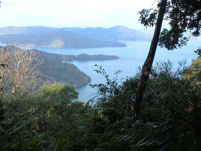 建物の周囲を一周した後、建物下の展望地へ移動。展望地からは南東に祝島を眺めることができた。展望地から急な傾斜となり、ロープを補助に坂を下る。やがて傾斜が緩み、縦走路は平坦な道に変わる。