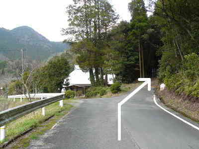 この先でくろがね鉄筋葛e川工場の会社前を通過、そのまま道なりに進むと最奥の民家前に着く。民家の前に続く林道には、獣除けの電線が渡されており、この右側のパイプを持ち上げれば車に乗ったまま林道奥へ向かうことが出来る。