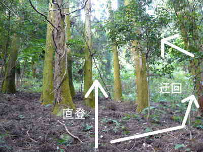 ところで、この場所に至るには、ヤブを避けて右側を大きく迂回する方法がある。私はこの道を帰る時に確認したため、大きく迂回しても、道を間違えることは無かった。登山時に迂回路を取る場合、直登の先の位置を頭に入れて迂回することをお勧めする。