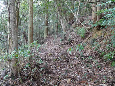 そのまま道なりに進むと右には石垣が続き、この上には民家跡が残っているのかも知れない。進路上に竹の茂るところが1ヶ所あるが、通行できるように最低限の部分が刈り取られていた。この先で右に注意していると 細竹の目立つところがあり、踏み跡が続いていたので入ってみた。