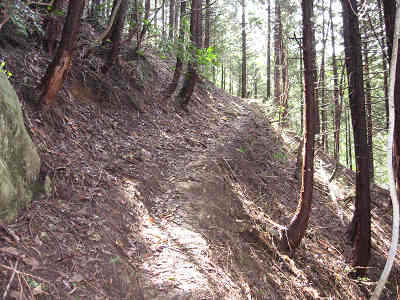 正面に春日山頂上まで1000mの標識を見るとその先右手の山腹につけられた細い登山道を進んで行く。いかにも滑りそうな細い道を慎重に進んで行くのだが、この道はとてもスリルがあって嬉しい。もし滑り落ちたらどこまで落ちてゆくのだろうか、眼下の急斜面をへっぴり腰で眺めながら、腰を落としてこの難所を通過、その先の檜林の中には一ヶ所だけ苔むした岩場があり、とても幻想的な世界が広がっている。