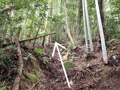 すぐに進路は西へ向き、千手観音の石仏に出会う。石仏の左から山道に入ると周囲には竹が目立つ。踏み跡と目印を確認しながら少しずつ高度を上げる。