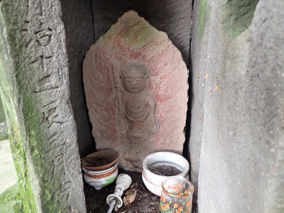 作業道の終点へ着けばこの先が春日山の山頂である。山頂には手水鉢、灯籠、祠が祀られ、祠の中には不動明王が鎮座されていた。