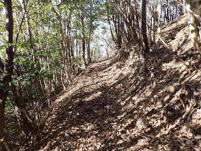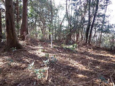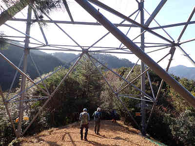 周囲が植林帯に変われば快適な尾根道に様変わり、やがて広く明るい場所へ着く。すぐに556mの標高点を通過、更に進むと進路は北へ向き、一気に高度を下げる。前方上に75鉄塔が見えてくれば、この鞍部から登り返す。