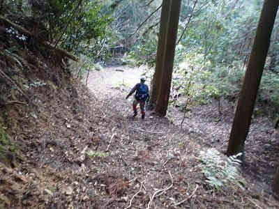 下山は快適な巡視路歩きで、76、75の鉄塔を過ごして西へ続く巡視路に入る。74鉄塔下を過ごせば谷へ下り、そのまま踏み跡を辿る。途中で炭焼き窯跡や石組みなどを眺め、沢付近まで下る。