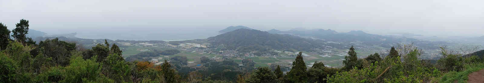 平坦な道を北西方向へ進むと、周囲は綺麗に伐採されており、間もなく北から西方面を見晴らす可也山の展望所へ着いた。北には火山の先に彦山がそびえ、長い海岸線を持つ虹ノ松原が続いている。いわゆる白砂青松の素晴らしい風景である。