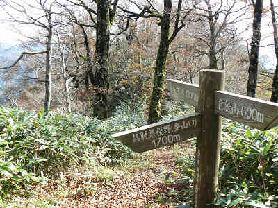 掲示してあるカタクリの説明を眺めて毛無山へと向かう。なお、この場所から毛無山まで600m、白馬山まで1,300m、俣野のサージタンク(登山口)まで1,700mと表示されている。毛無山へと向かっていると単独行の登山者と出会う。ご挨拶をするとこの方は高知県から来られたNさんで、「登山&旅紀行」のブログを管理されているとのこと。この周辺の山々に登られているそうなので、烏ヶ山について聞くと、2〜3日前に登られていた。烏ヶ山の詳細な情報を教えて頂き、明日の登山は大丈夫という確信を持つ。
