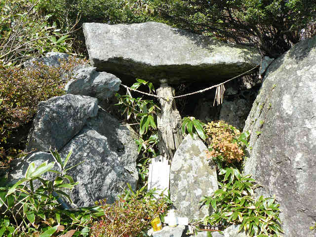 右手に紅葉のクラゲブナを過ごし、左右に笹の茂る緩やかな坂を進むと五合目に到着。落葉を踏みしめながら自然林を進むのが気持ち良い。平坦路を進んでいると右手に力岩、これは大きい。力岩を過ごすと横木の階段の渡された坂を登ることになり、坂を登れば右手にやはり大きな蔵之助岩が座っている。岩の上に登りたい衝動に駆られるが、まだ先は長い、帰りに元気だったら登ってみよう。