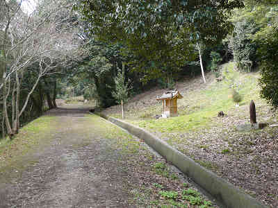 正面に大きな忠魂碑を見て右へ続く登山道を進む。軽車両なら楽々進めるような広い道を進むと、右には奉納された砲弾を過ごし、少し先の分岐から右上へ向かうと、稲荷神社が祀られている。元の道に戻ると、左には藤原成親供養塔と藤原成親供養塔下古墳を見る。