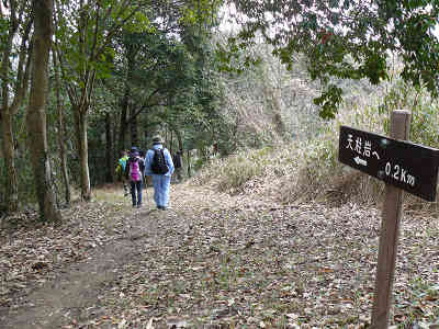 周囲には表面が平らな岩が目立ち、その中でも一番南側に位置する大きな岩か鏡岩である。確かに鏡のように真っ平らな岩をしばらく観賞する。その後三角点まで戻り記念撮影、次は石船古墳へ0.5kmの案内に従い東へ向かって坂を下る。