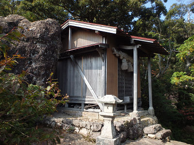 熊野神社拝殿と本殿 間もなく山頂の熊野神社へ到着、その先には凝灰角礫岩のテラスが用意されていた。展望広がる絶壁のテラスからは、眼下に植林帯が見えており、その高度差に圧倒される。勇気を出してテラスの端から下を眺めれば、そのまま真下まで落ちてしまいそうな、そんな気のする展望テラスである。