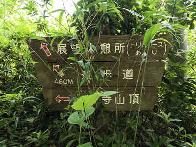 ゆっくり歩きで高度を上げていると左右に山道が分岐しており、石仏が祀られていた。74番と石仏に彫られていたので八十八ヶ所巡りの石仏かも知れない。もう少し高度を上げれば再び広く平坦な場所を通過、この先で展望地と金光寺との分岐に着く。最初は展望地方面から山頂を目指すコースをとってみた。