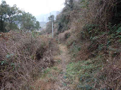 樹林の下につけられた道を辿ると、電柱の立つ谷へ着き、この先は電柱沿いに坂を下る。左手には手すりのような施設が残っており、昔この付近は耕作地として使用されていたのかも知れない。急な坂を淡々と下れば、進路は左方向へ変わり、沢を渡る。この先は再び電柱沿いに坂を下り、足下が平坦になると誠徳院へ着いた。