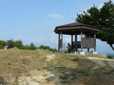 角楼跡 この施設は、城壁から凸型に張り出し、正面と側面から攻撃出来る優れた防御施設である。「角楼」の先には復元された三階建ての「西門」があり、一階は門扉のある石敷きの通路、二階は城壁の連絡路、三階は見張り及び戦闘の場に想定されている。なお、「角楼」から西へ少し坂を登ればこの付近が鬼ノ城山の山頂(397m)で休憩舎が設置されている。