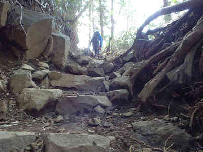 次第に坂の傾斜がきつくなるので、登る速度は極端に遅くなる。植林帯の下、展望は望めないものの、ワイルドな岩道や木の根の目立つ道を楽しみながら進む。やがて木の間越しに芦ノ湖や長尾山、丸岳などが見え始めると、高度が上がっていることを実感する。