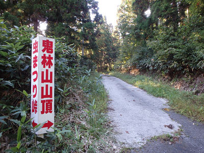 トップに戻る 2015年に登った山リストへ戻る 山名アイウエオ順 2015年10月 4日 駐車地 →1:10→ 山頂 →1:00→ 駐車地 全歩行時間 2時間10分 日南町にそびえるの鬼林山へ向かうにはJR伯備線の生山駅を出発、岩見川沿いに県道8号を南下する。「木材団地」の案内に従い分岐を右折し、奥日野広域農道に入り、亀山大橋を渡る。 そのまま道なりに農道を進み、「鬼林山虫まつり峠入口」の案内が左に見えてくれば、この分岐を左折する。少し進むと左側へ折り返すように鬼林山へ続く道が分岐している。この先の広い場所へ車を置いて登山を開始する。なお、この登山道は山頂まで舗装道が続いているので、暗くなってもヘッドライトさえあれば、歩くのに心配はいらない。 舗装道に入り、快適な登山道を進む。左右に植林帯と自然林の混じった植生の木々を見ながら進んでいる、左に虫まつり峠への案内を過ごせば、頭上に山頂へ続く電線が走っており、その先には青空が覗いている。