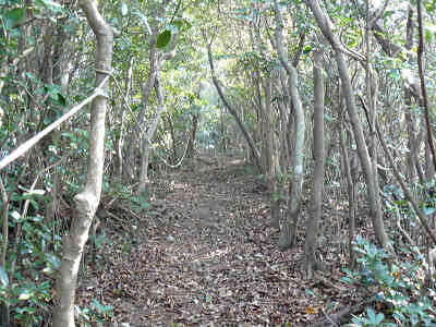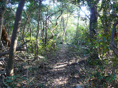 岩の目立つ場所を抜け、植林帯の下につけられた平坦な道を進めば、やがてロープの渡された下り急傾斜の入口へ着く。この付近で竜王山から鬼ヶ城へ縦走するという登山者と出会い、お互いの健闘を称え合う。更にもう少し下った途中でも登山者と出会うが、この人は汐見岩まで行くのが目的とのこと。