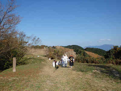 南から西の展望(クリックで拡大) 福岡県の山について、そんなに詳しくない私でも解るくらい周囲には名峰がそびえ、西に背振山手前に九千部山、眼下には鳥栖の町並み、その先には耳納山地、更に右には古処山、屏山と続いている。 南から西の展望(クリックで拡大) 展望台からすばらしい展望を満喫したので山頂まで引き返し、東の展望を眺めると、展望台からは死角になっていた砥上山、大根地山、宝満山に三郡山が一望で、本当に素晴らしい。背後の西に広がる背振山や九千部山等、しっかり展望を眺めて今度は北の草原へ向かってみる。 山頂から西の展望(クリックで拡大) この途中で大勢の白装束の人々を見たので、今日は基山山頂で何らかの儀式があるのかもしれない。さて、草原へ着くと基肄城(きいじょう)跡の石碑が建ち、その先には展望台が設置されている。