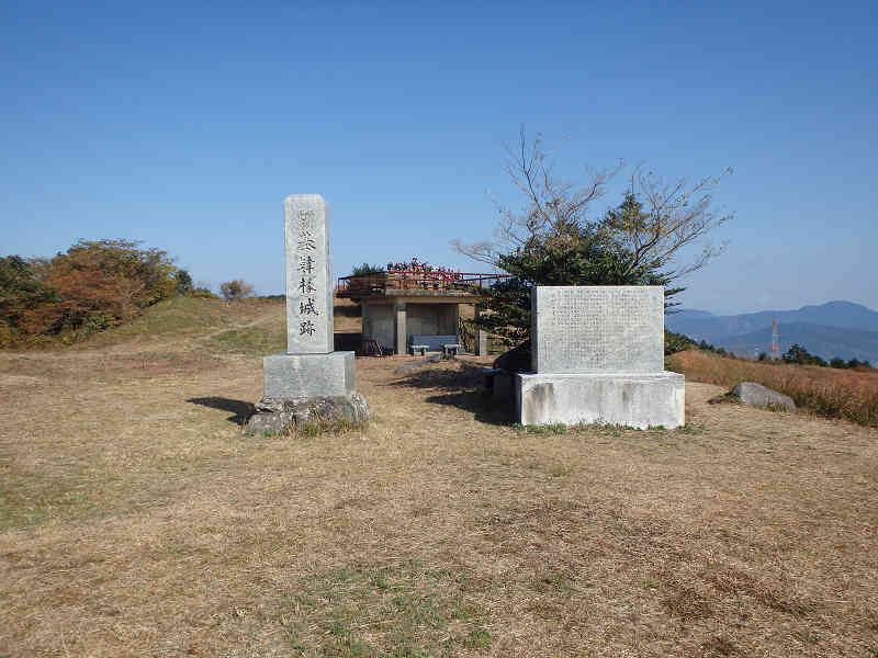 礎石群を過ごし、緩やかな傾斜の道を進むとこの先で左からの道と合流する。この上に展望台らしき施設を見ながら道なりに進み、わずかに高度を上げれば広い原に着いた。左右に草原が広がり、右には手前に石柱が置かれ、丘の上に先ほどまで眺めていた展望施設が建っている。 左を眺めれば一段高い丘陵があり、こちらが山頂と思われる。頭上を飛行機が飛ぶなか、山頂へ向かって左へ進路を採る。やがて「いものがんぎ」の案内を過ごし、一段高い丘陵の上に着くと、一等三角点の置かれた基山山頂へ到着した。 山頂の南側の大岩には石祠などが置かれ、何かが祀られているようだ。大岩の背後へ向かうと、背の高い塔が建ち、反対側へ回ってみると天智天皇欽迎之碑と刻まれていた。更に南側へ向かうと展望台が設置され、この上からはすばらしい展望が広がっている。