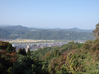 紅葉の美しい場所が見えてくれば、左に中腹の展望所へ続く道が分岐する。この展望所は、わずか40m先なので立ち寄ってみる。わずかな傾斜の坂を登ればすぐに東屋の建つ展望所へ到着、展望所からは南西に鬼っ子ランドの鬼ミュージアムが見えているが、これ以外の展望は木々に阻まれていた。