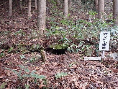 すぐに左右の分岐があり、左が登山道、右はオンドル跡への寄り道である。ここではオンドル跡を眺めるため右道を採る。登山口からは5分程度でオンドル跡へ到着、これは昔の床下暖房で、石の中で槇などを燃やし、足下を暖める構造となっている。明治の時代にはもう使われなくなっていたので、使用されていたのは江戸時代までだろう。