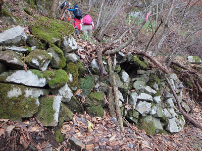 この付近の足下には、作業道用に組まれた石組みが残っており、貴重な遺跡を眺めて先へ進むと登山道に合流する。しばらくは杉の植林帯の下につけられた登山道を進む。坂の傾斜が急なのでゆっくり歩きが続く。ジグザグを描きながら高度を上げれば、進路は少しずつ右方向へ向き、自然林の下へ着けば、見晴台跡へ着く。但し、展望自体は向かいの山が見える程度で、絶景が広がるわけでは無い。