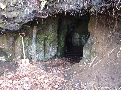 この付近には銅の精錬により廃棄されたカラミを多く見る。急斜面の先には石組みが多く、精錬用の作業所がこの付近に多く存在したことの証しであろう。平坦な地点で足下を探せば簡単にカラミを見つけることができる。 さて、更に坂を登れば竪穴の坑道跡が残っており、もう少し上には横穴式の坑道跡が当時のまま残っている。登山道を離れてこの坑道へ向かう際、足下に注意しているとカラミがあり、このカラミの中に緑色の緑青を見つけることができる。これこそが、この金山谷鉱山で銅を産出していた証しである。 この先にある横穴式坑道は奥行きが約30mあり、ライトさえあれば中に入ることができるので探検してみる。ライトに光る細かい粒子を最初は鉱物の光だと思っていたら、これは水滴だった。