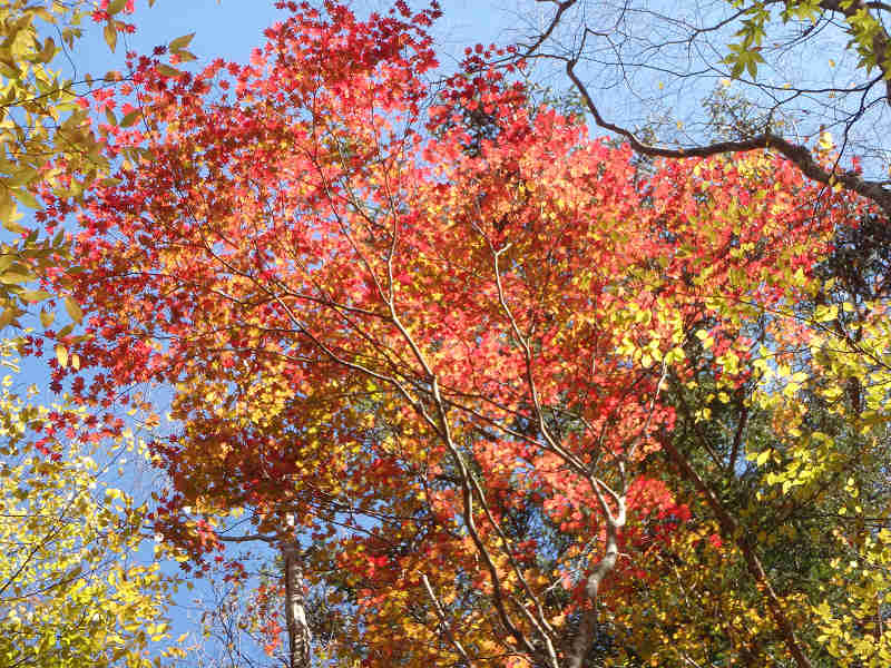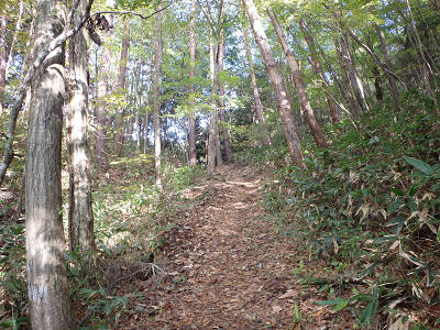 向峠を出発と同時に頭上の木々の間から青空が顔を出し、一気に足下が明るくなる。これは木々の立っている間隔が広がってきたためだろう。なおかつ、紅葉により色づく木々もこの先増えてきた。丁度この向峠を越えた付近を紅葉前線が通過中で、しばらく美しい紅葉が続く。